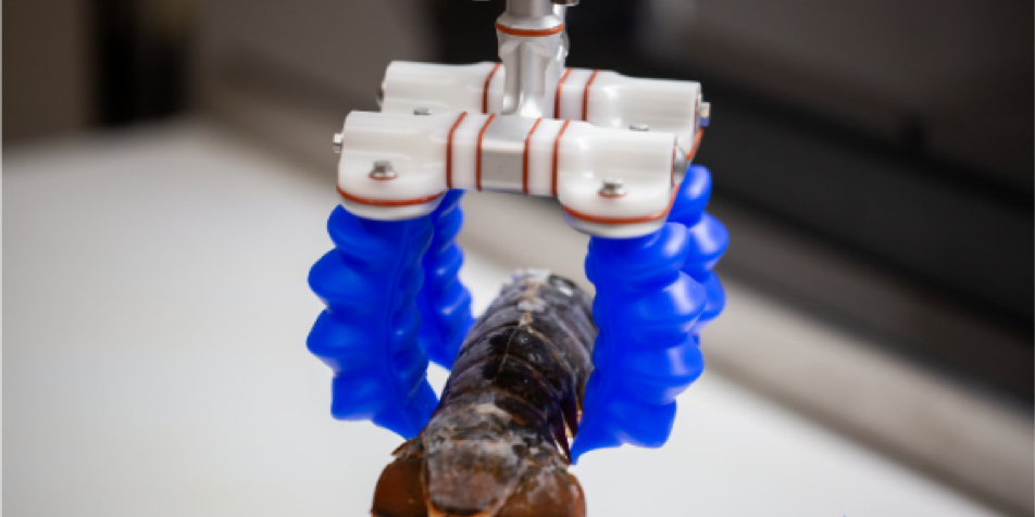A soft gripper (of Soft Robotics), either fixed to a cobot arm or as a stand-alone is used to pick up various food produce.